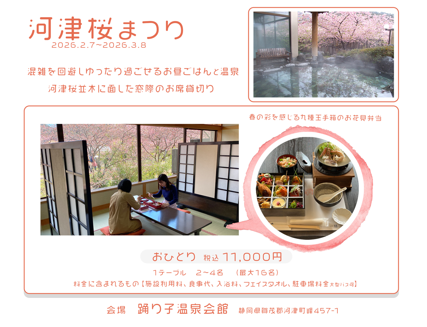 毎年大好評の「河津桜まつり」の混雑を回避 河津桜並木に面した大きな窓側の席を3時間貸切り。